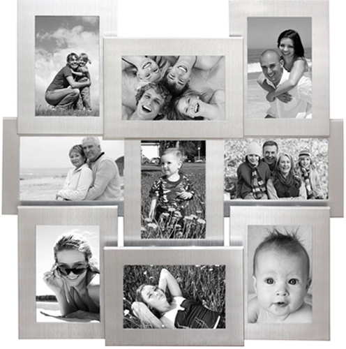 ein Bilderrahmen mit Platz für 9 Bilder, 5 Bilder hochkant oder 4 Bilder waagerrecht, Grösse der kompletten Collage: 45 x 45 cm, im Karton mit Styropor verpackt, zum Aufhängen oder Hinstellen, aus Aluminiumgehäuse und Glasscheiben,