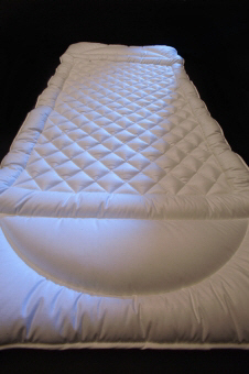 Ein ansprechendes Design war uns sehr wichtig, darum haben wir eine Spezialsteppung eigens für dieses Modell entwickelt. Einen eigenen von der Liegefläche abgetrennten und etwas erhöhten Kopf und Fußteil. Die etwas festere Steppung im Bereich des Rückens und der Beine garantiert eine bessere Anpassung an den Körper und eine bessere Luftzufuhr unter den Körper.Die Festigkeit, die diese Steppung benötigt,erreichen wir durch das Befüllen des Unterbettes mit 1300 Gramm siliconisierter Hohlfaser (Flaumfaser) bester Qualität. Spanngummis an allen vier Ecken sorgen für eine optimale Spannung des Unterbettes und verhindern zusätzlich noch ein verrutschen,was allerdings auch ohne diese Spanngummis fast unmöglich ist.